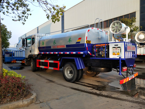多功能抑塵車主要結(jié)構(gòu)是在行走機(jī)構(gòu)上加裝大容積水罐、高效遠(yuǎn)程霧炮系統(tǒng)、低壓沖洗灑水系統(tǒng)、綠化灑水高炮(選裝,在罐體前端)、液壓系統(tǒng)、專用的作業(yè)和行走電控系統(tǒng)等改裝而成,其性能在國內(nèi)處于領(lǐng)先水平。