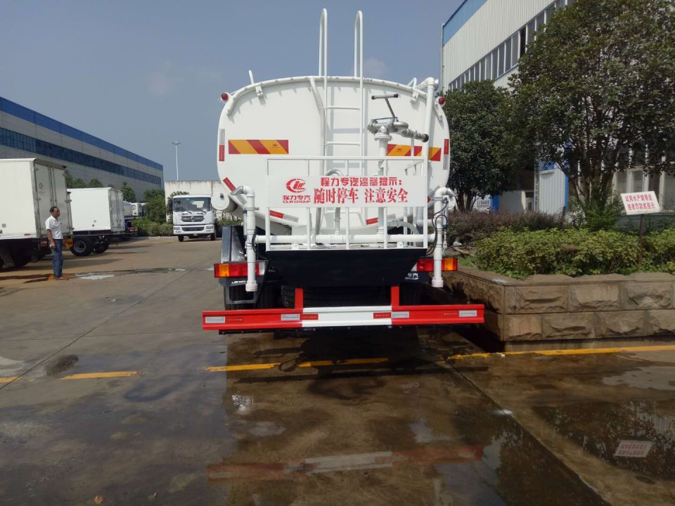 上裝配置:罐體采用5mm厚武鋼集團(tuán)供應(yīng)的罐車專用板材制作,容積:20立方;罐內(nèi)3道防浪隔板具有防波作用,減低罐內(nèi)液體的沖擊。配備國內(nèi)大功率灑水車專用水泵,可自吸自排,引水時間<15min,流量60m3/h,揚程90米。東風(fēng)天龍灑水車其它專用部分標(biāo)配為:前沖、后灑、側(cè)噴、后工作平臺、360度可調(diào)節(jié)綠化水炮,水泵垂直吸程≧7米,前沖灑水寬度≧16米,綠化水炮射程≧35米,自流閥、濾網(wǎng)、消防接口(可連接消防栓取水,可作應(yīng)急消防用)。罐前量管(觀察罐內(nèi)水位)、罐后爬梯、罐上罐口帶簡易護(hù)欄、罐側(cè)雙炮筒、6米長4寸鋼絲塑膠管兩根,罐體表面雙層油漆工藝,防銹、耐腐蝕,其余有廠家標(biāo)配?蛇x擇加裝加裝藥盤、氣動控制閥、噴藥設(shè)備、罐內(nèi)防腐等。