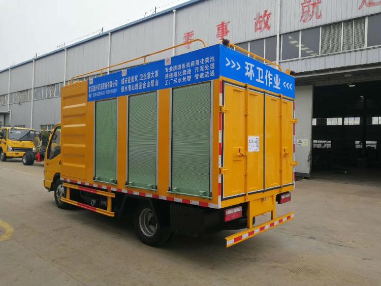 底盤型號:EQ1041SJ3BDF,發(fā)動機(jī)玉柴YC4FA115-50,7.00R16鋼絲胎,帶動轉(zhuǎn),氣剎,方向助力,整車顏色工程黃。 上裝配置:18.5千瓦電機(jī)1臺,配電柜1臺,4寸排污泵一臺,5.5KW水循環(huán)真空泵1臺,3方高壓水箱,1.5立方液壓絞龍式/滾筒式污水分離箱,帶高壓清洗功能,采用意大利普蘭索特16MPA高壓泵,箱體材質(zhì)采用熱板制作,后部帶LED屏,配工具箱一個。100mm吸污管4根(每根6米),60米Ф19mm的高壓管,帶10個噴頭。