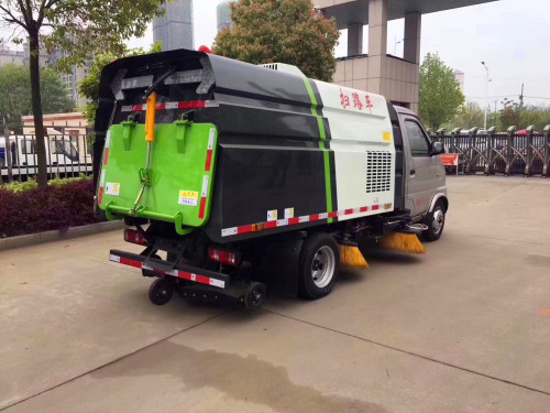 4、東風2噸小型掃路車采用中置4盤刷+后置吸盤的清掃結構,三段式工作,清掃效果更好。