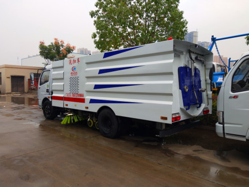 東風多利卡洗掃車采用東風型國五二類底盤改裝,加裝副發(fā)動機、風機、高壓水泵、清水箱、垃圾箱、左右立掃、帶噴水桿的寬吸嘴、低壓沖洗系統(tǒng)、垃圾箱自潔,掃盤降塵系統(tǒng),液壓系統(tǒng)、專用裝置電控系統(tǒng)和副車架等改裝而成: