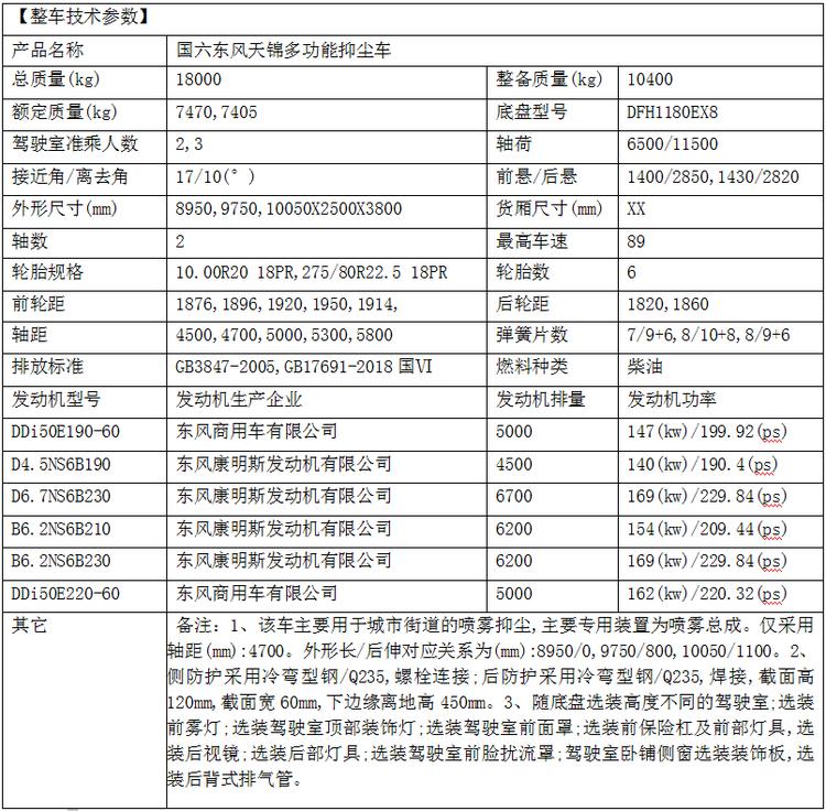 東風(fēng)天錦霧炮抑塵車底盤配置: