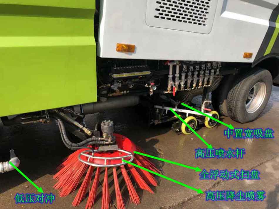 4)、采用“中置兩立掃+中置寬吸嘴(內(nèi)置高壓水噴桿)+左右高壓側(cè)噴桿”的結(jié)構(gòu)。
