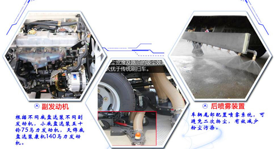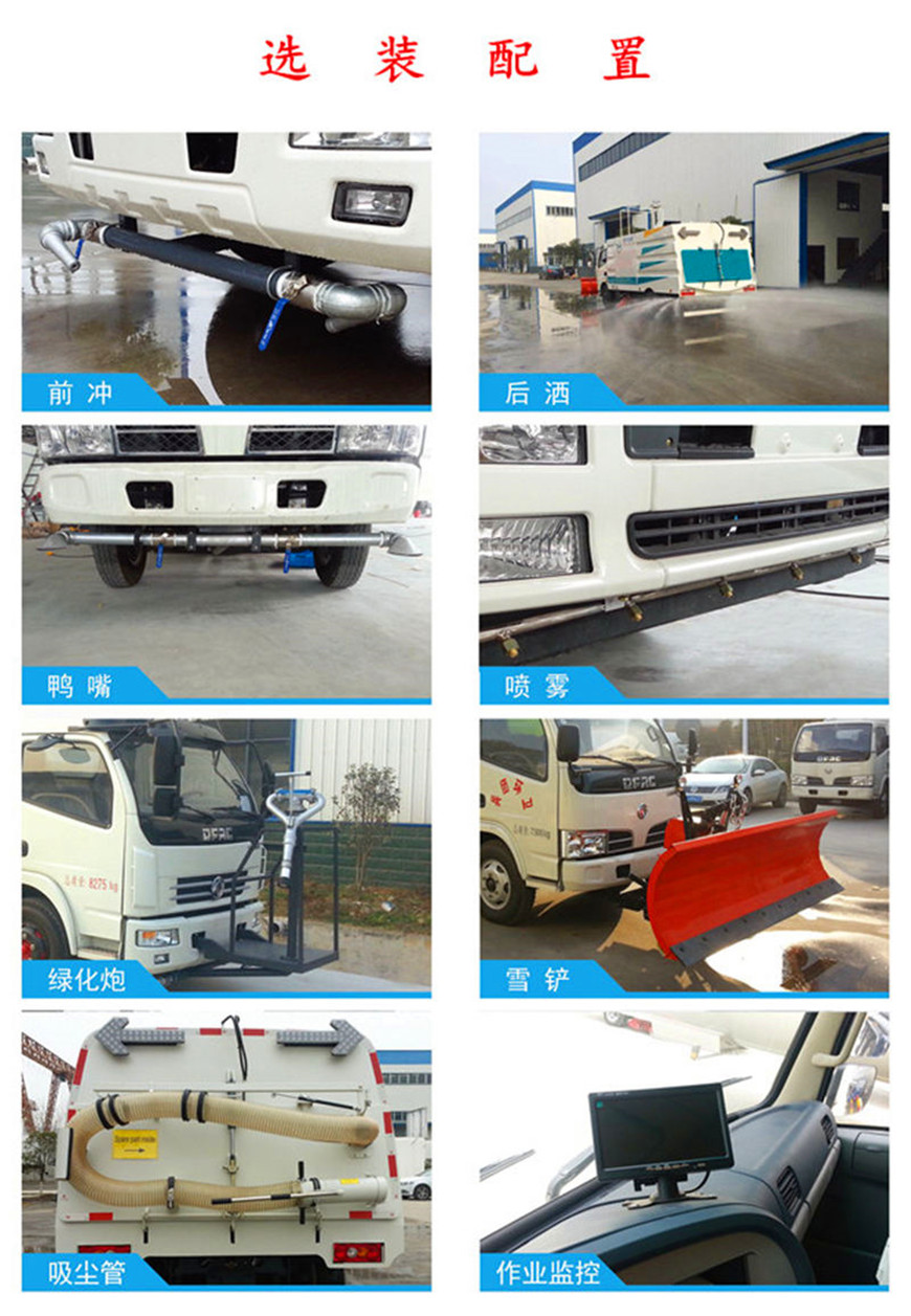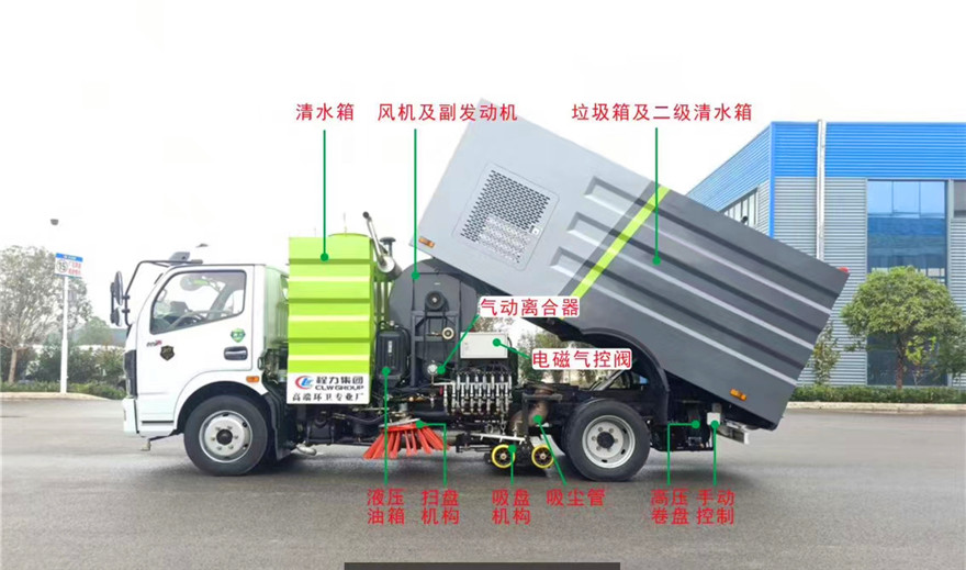 東風(fēng)8方洗掃車采用東風(fēng)型國五二類底盤改裝,加裝副發(fā)動機、風(fēng)機、高壓水泵、清水箱、垃圾箱、左右立掃、帶噴水桿的寬吸嘴、低壓沖洗系統(tǒng)、垃圾箱自潔,掃盤降塵系統(tǒng),液壓系統(tǒng)、專用裝置電控系統(tǒng)和副車架等改裝而成: