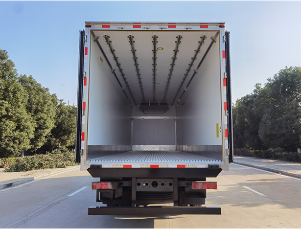 汕德卡9米6氣囊橋冷藏車廂體配置為:斷橋隔溫工藝,整體結構框架,內外面料為3mm新款啞光玻璃鋼夾保溫層真空復合而成,廂體厚度為8cm,最新款鋁合金包邊型材,型材局部厚度為4mm(鋼制鉚釘加固),廂體內部采用2個LED照明燈及廂體示寬燈,后門框不銹鋼材質,門框密封條為三元乙丙橡膠材質,加厚型不銹鋼合頁及鎖件;副梁為Q700車用大梁鋼,15mm厚大梁墊皮,加裝防撞膠塊,不銹鋼門鎖件,配后雙開門,副駕駛一側居中靠前開單側門一個,帶2個排水孔。汕德卡9米6氣囊橋冷藏車冷機配置:可選安裝颶豐,凱利,凱雪,冷王,開利等冷藏機組,最低溫度可達-18度。車廂內溫度可根據需求自由調節(jié);溫度控制器安裝在駕駛室內,方便操作控制。選裝配置:通風槽,肉鉤導軌,卡槽等。