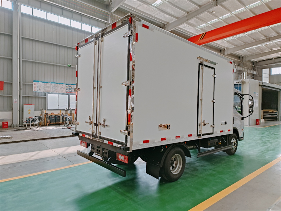 廂體底部為塑鋼花紋板,廂內(nèi)側(cè)面帶圍裙,前部排水孔,門邊條采用防雨設(shè)計(jì)和迷宮式橡膠密封條,鋁合金型材包邊,不銹鋼包角,不銹鋼門鎖,加厚型不銹鋼后門合頁(yè)及鎖件,廂體內(nèi)采用LED照明燈。
