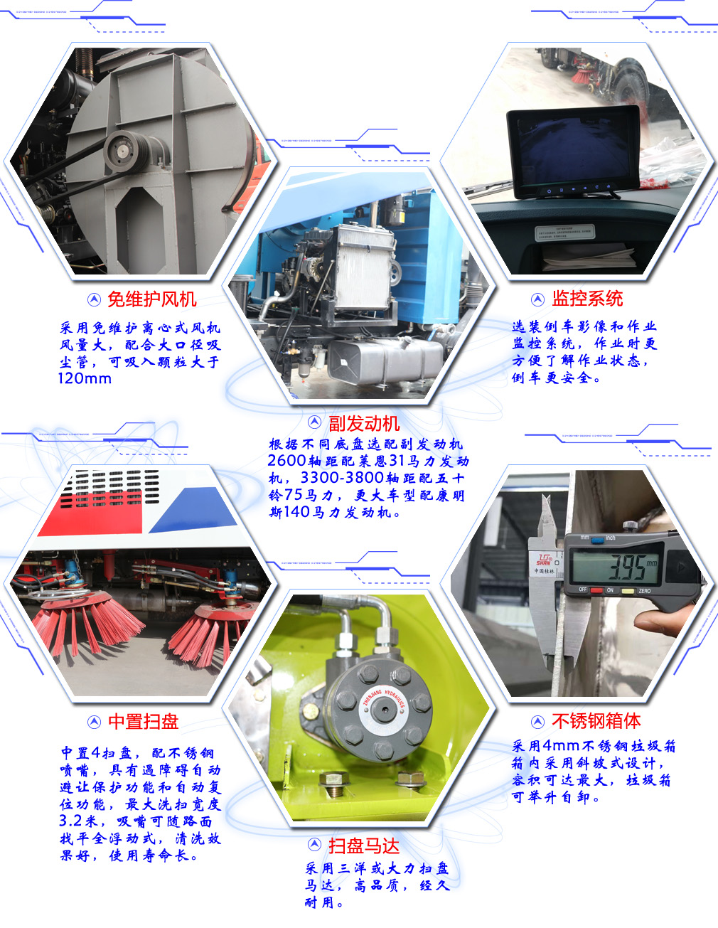 此車為道路洗掃專用車輛,專用裝置為掃刷.防護(hù)裝置均采用Q235A材質(zhì),均采用焊接連接, 專用裝置掃刷代替部分側(cè)面防護(hù),掃刷離地高為(mm):180,后下部防護(hù)與車架焊接連接, 后下部防護(hù)尺寸:50×150(mm),離地面高度420mm. ABS系統(tǒng)型號為XH-KQ4S4M-E01, 生產(chǎn)企業(yè)為廣州市西合汽車電子裝備有限公司;型號為CM4XL-4S/4M, 生產(chǎn)企業(yè)為廣州瑞立科密汽車電子股份有限公司.整車長/軸距對應(yīng)關(guān)系為(mm):7590/4200,7890/4500, 8090/4700,8590/5200,8990/5600,4700/8310,5200/8680.選裝不同的外觀圖片.隨底盤選裝駕駛室. |