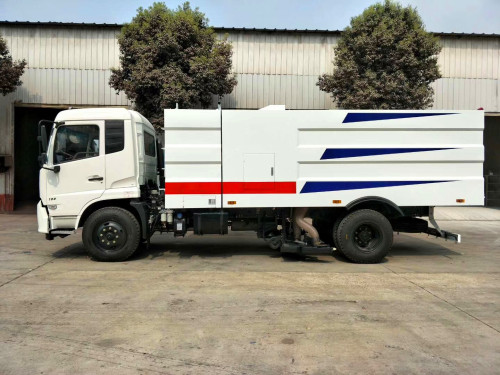 該掃路車采用東風(fēng)天錦型國五二類底盤改裝,加裝副發(fā)動機(jī)、風(fēng)機(jī)、清水箱、垃圾箱、左右立掃、后置吸盤,掃盤降塵系統(tǒng),液壓系統(tǒng)、專用裝置電控系統(tǒng)和副車架等改裝而成(可加裝前沖后灑,可以根據(jù)客戶要求做成方形、圓形箱