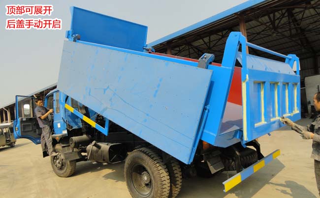 載重量10噸,外形尺寸長(zhǎng)4.2米,寬2.3米,高0.8米,采用4毫米厚鋼板制作,箱頂可展開,可向兩邊展開折疊,箱底雙缸液壓自卸,手動(dòng)開啟尾門。